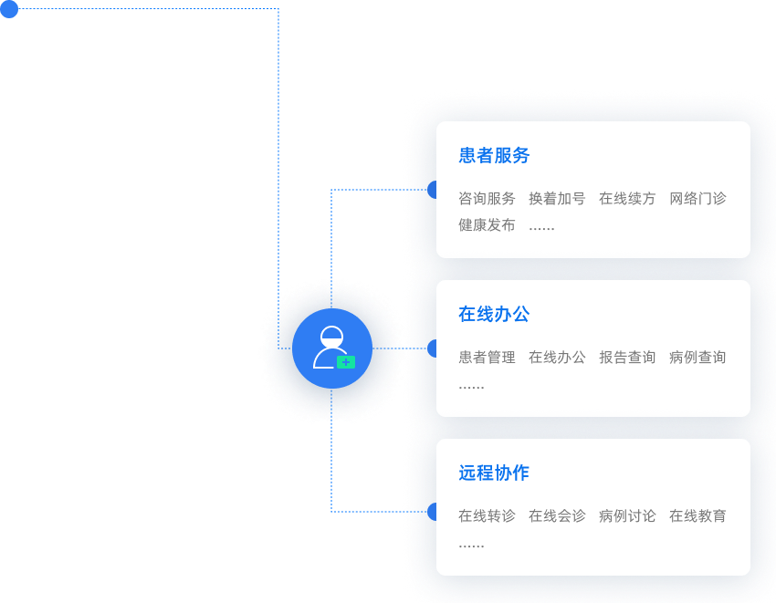 • 實現(xiàn)遠程醫(yī)療服務管理級遠程醫(yī)療服務,包括遠程會診、遠程門診、遠程診斷、云影像等業(yè)務。